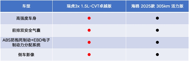 海鸥虽然也配备了主被动安全配置,但纯电车型在长途行驶,特别是路况不好的情况下,底盘磕碰、电池热管理这些问题,确实是需要多留意的。换言之,身为油车的瑞虎3x卓越版在安全层面的确定性更高,更让人放心。